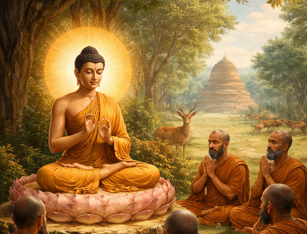 Soon after his enlightenment, the Buddha travelled to Sarnath, where he delivered his first discourse to five former companions. This teaching, known as the Dhammacakkappavattana Sutta, introduced the Four Noble Truths and the Noble Eightfold Path. With this, the Sangha—the community of monks—was born, marking the beginning of the spread of the Dhamma.