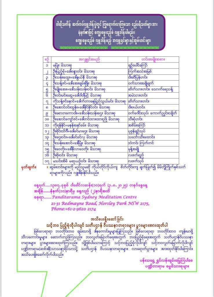 PSMC is organizing Myanmar traditional ကဆုန်ညောင်ရေသွန်းပွဲ (watering the Bodi tree) / Vesak Day celebration on 11 May 2025. The event will begin 10 am with Sayadaws’ chanting follow by watering the Bodi tree. 11 am offering of lunch dana to Sayadaws follow by offering of Myanmar Mohinga (donated by Ma Yin Yin, brother Ko Nyunt Htay siblings’ family) to all guests. Listening to Sayaday’s Dhamma Talk by 1pm follow by sharing of merits before ending the ceremony…