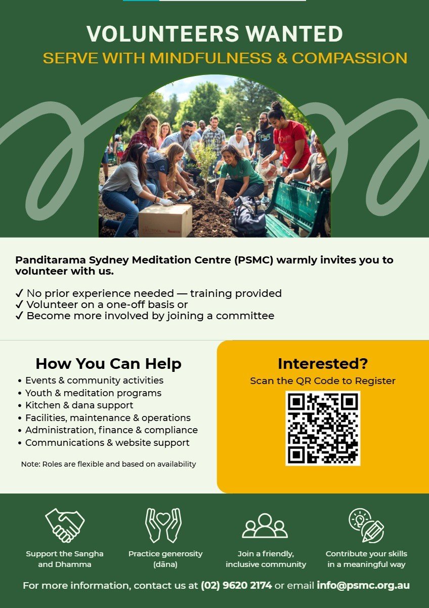 Volunteering at Panditarama Sydney Meditation Centre is not just about giving your time—it is an opportunity to practice generosity, deepen your meditation practice, and support a community dedicated to the Dhamma.