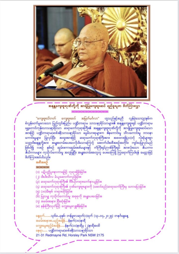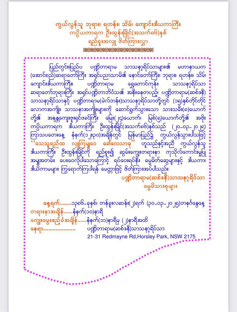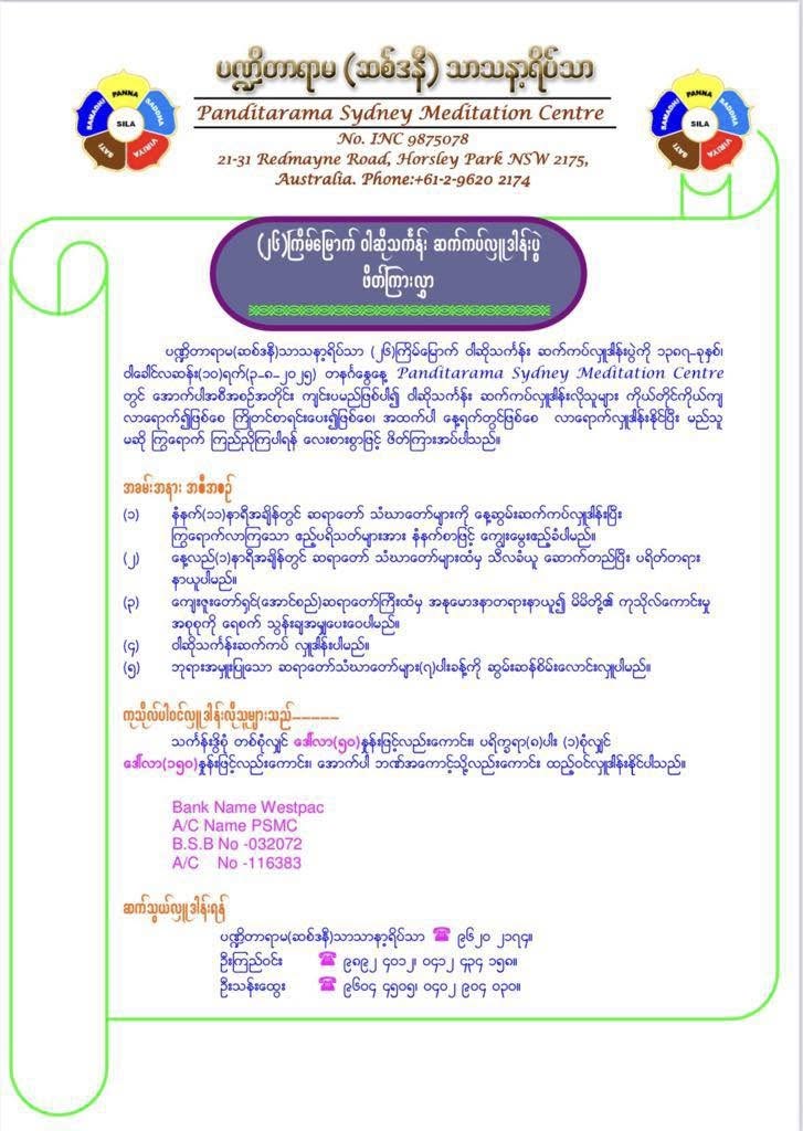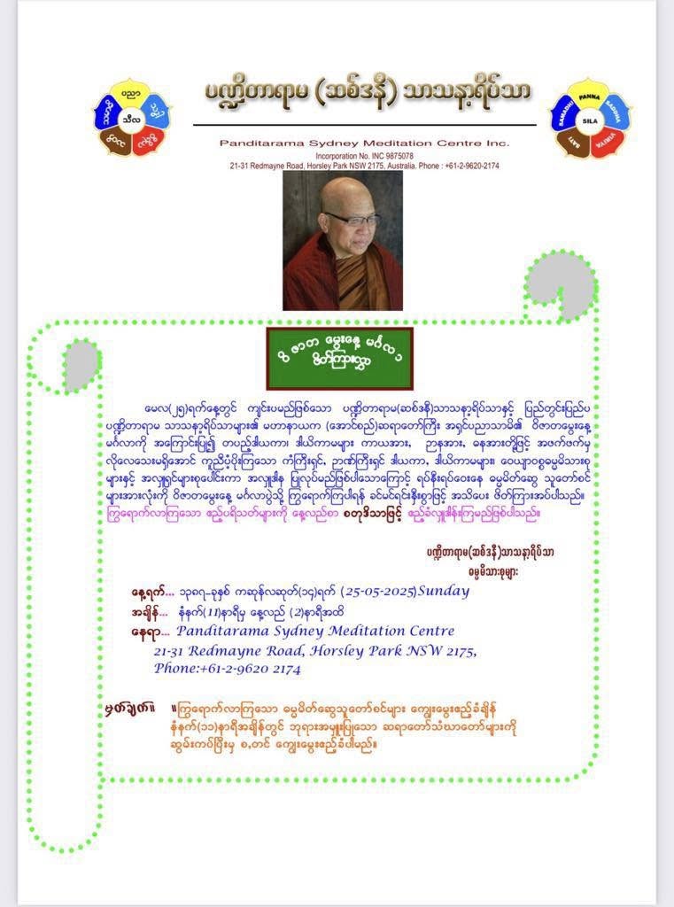 PSMC is organizing Myanmar traditional ကဆုန်ညောင်ရေသွန်းပွဲ (watering the Bodi tree) / Vesak Day celebration on 11 May 2025. The event will begin 10 am with Sayadaws’ chanting follow by watering the Bodi tree. 11 am offering of lunch dana to Sayadaws follow by offering of Myanmar Mohinga (donated by Ma Yin Yin, brother Ko Nyunt Htay siblings’ family) to all guests. Listening to Sayaday’s Dhamma Talk by 1pm follow by sharing of merits before ending the ceremony…