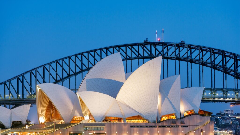 Sydney is situated on latitude 34° S and has an average mean temperature ranging from 72 °F (22 °C) in January to 55 °F (13 °C) in July. It’s warm, sunny, but temperate climate has encouraged its citizens to develop a pleasure-loving and easygoing attitude to life and to make full use of the opportunities for sailing, swimming, and surfing at their doors.